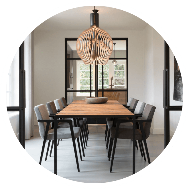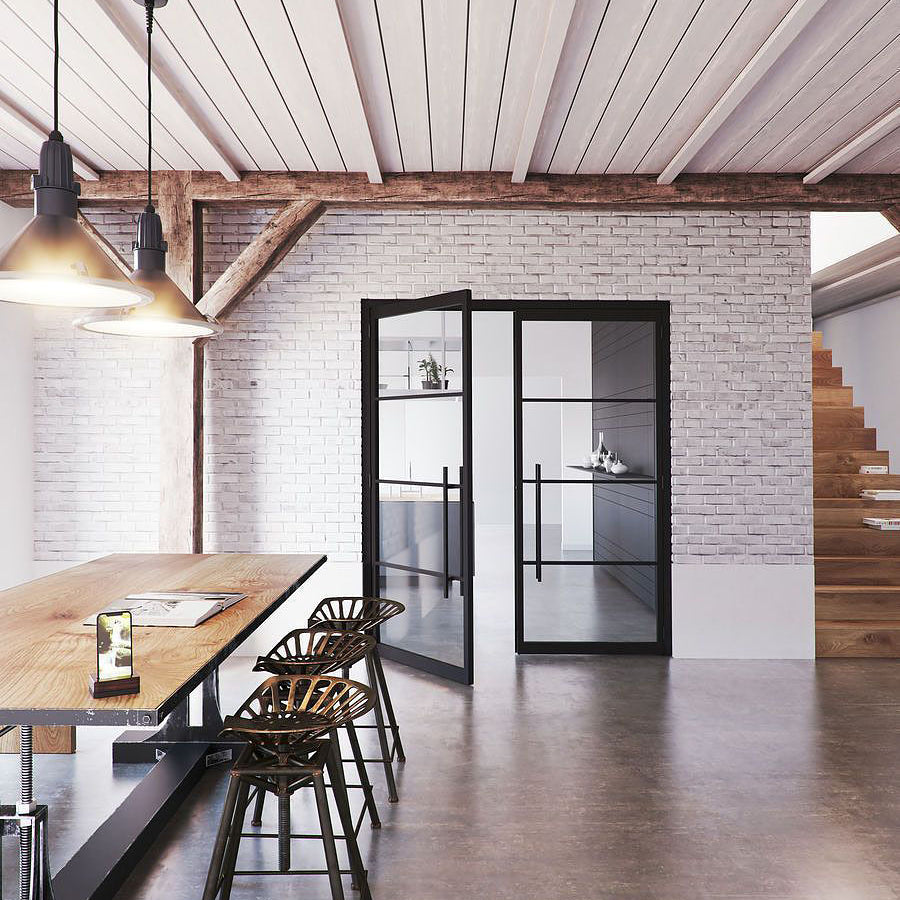 Um Ihrem Interieur die echte Atmosphäre eines ländlichen und industriellen Interieurs zu verleihen, ist es gut, mit den Grundlagen zu beginnen. Machen Sie es cool, aber gehen Sie nicht zu sehr wie bei einem industriellen Interieur. Wählen Sie zum Beispiel einen hellen Holzboden oder Betonboden, weiße Wände, schwarze Elemente und eine Akzentwand. Eine Schiebetür oder Dachbodentür aus Holz bringt beide Welten zusammen. Dieses sogenannte „Scheunentor“ ist auf Bauernhöfen zu sehen, hat aber auch einen schönen industriellen Look. Auch ein großer Gerüstholztisch mit Stahlbeinen und eine verwitterte Bauernlampe passen perfekt zu beiden Prinzipien.