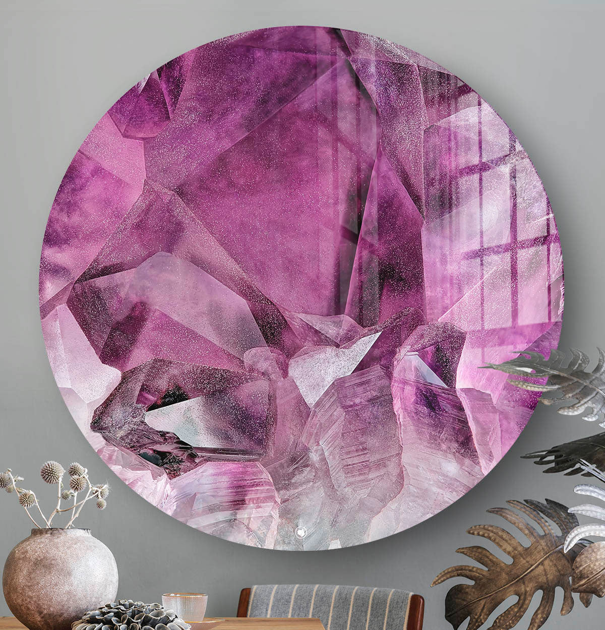 Woonkamer met wandcirkel met roze kristallen erop uitgebeeld.