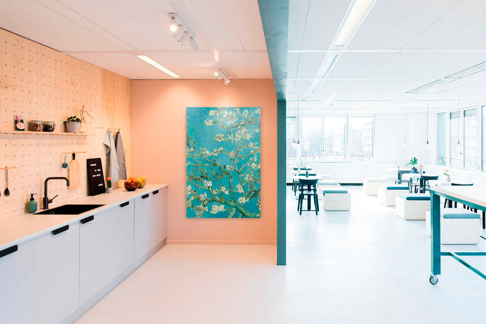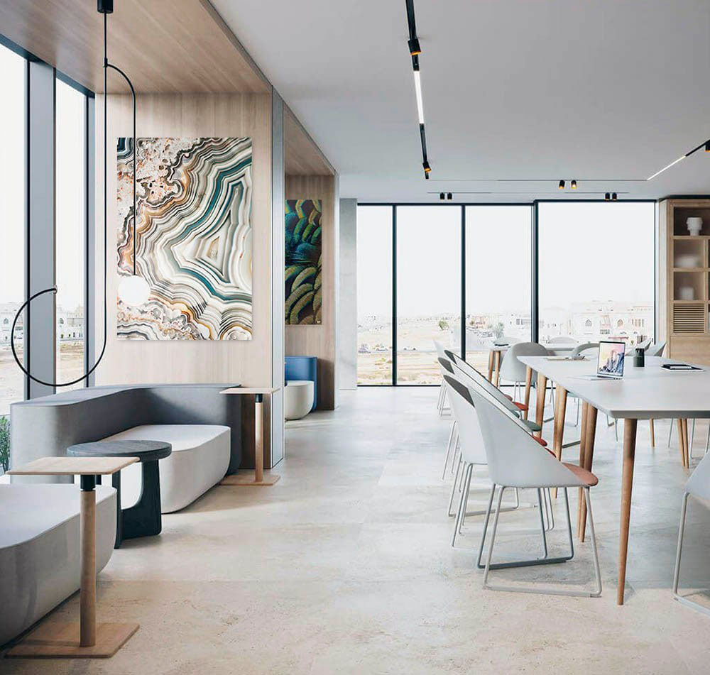 Vervolgens ga je op jacht naar items die perfect matchen met het moodboard. Het is handig om te beginnen met de wanddecoratie van je kantoor. Inspirerende designs zorgen voor meer motivatie en daarmee een productievere werkomgeving. Wist je dat flitsende, abstracte motieven het creatieve centrum van de hersenen stimuleren? Ook kleurcontrasten werken goed. Accessoires zijn dan weer ideaal om accenttinten mee te creëren. Denk hierbij niet alleen aan kussens en plantenpotten, maar ook aan klokken, prullenbakken en kapstokken. Al deze items helpen je om bijvoorbeeld de branding van je bedrijf kracht bij te zetten. Zet voor je shoptrip het moodboard op je telefoon, zodat je in één oogopslag ziet of het erbij past. Zo kom je stap voor stap tot de ultieme sfeer!