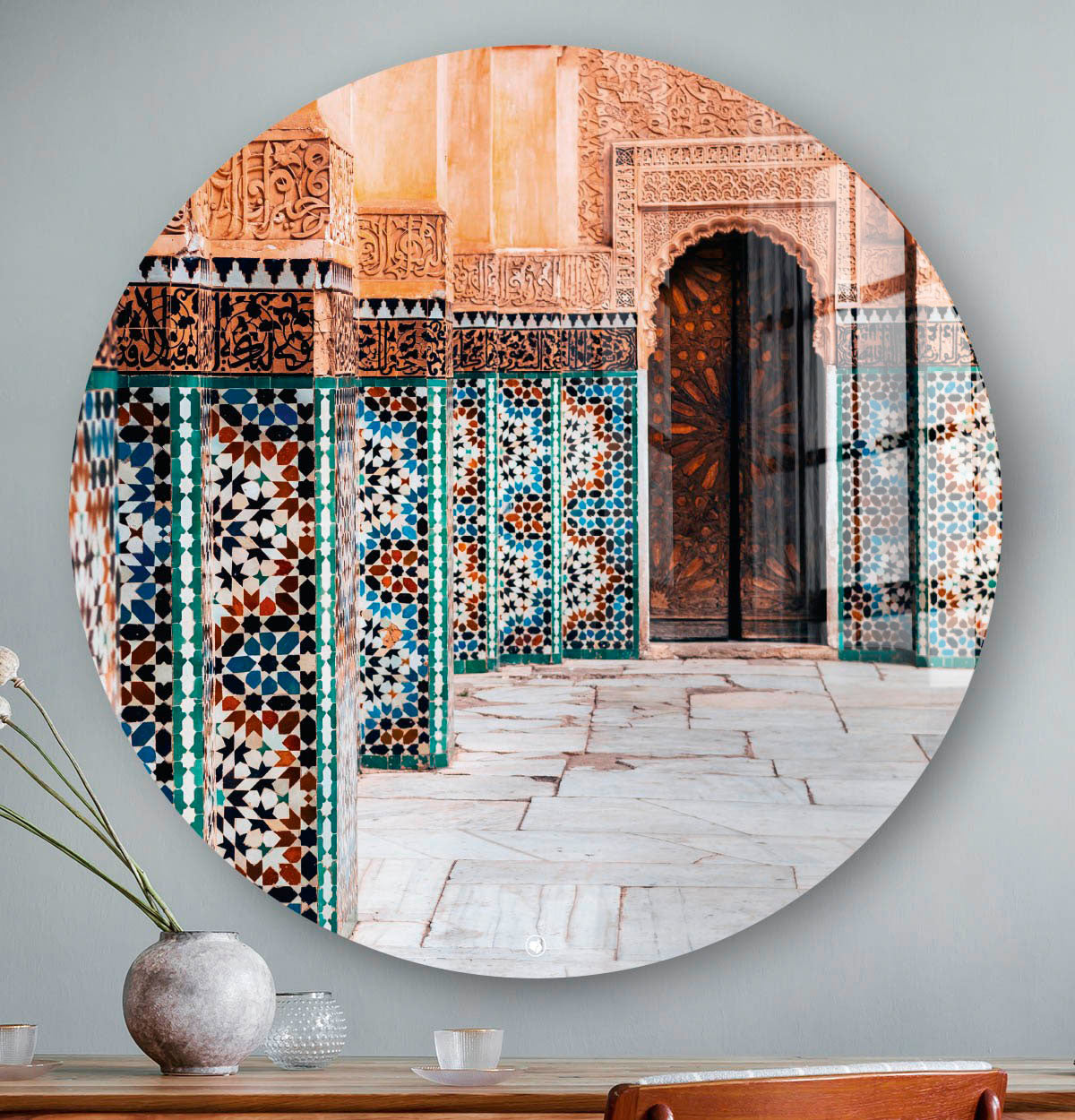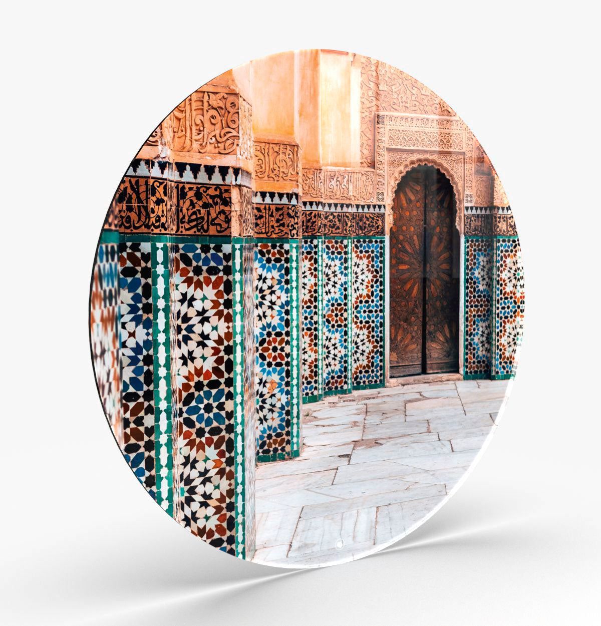 Als er één plek op aarde op je bucketlist moet staan is het Marrakesh. Deze prachtige stad in Marokko heeft een rijkdom van architectuur. Op deze wandcirkel zie je de prachtige terracotta kleuren, geometrische uitsneden, vormen die lijken op mozaïek en kleurrijke tegels, rondom een sierlijk bewerkte grote houten deur. Het samenspel van deze elementen geven een beeldschoon beeld. Het lijkt wel onderdeel van het verhaal duizend en één nacht. Met deze wanddecoratie breng je de sfeer van Marrakesh in je eigen interieur. Hang hem in de woonkamer, slaapkamer, kantoor of hal. Het premium materiaal van de muurcirkel is van prachtige, stevige kwaliteit. Kies een groot formaat voor een statement aan je muur, of combineer de muurcirkel met andere werken uit de collectie. Overal zal hij je doen verwonderen.
