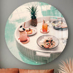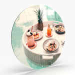 Goodmorning! Wat is het toppunt van luxe? Je dag beginnen met een floating breakfast: een drijvend ontbijt geserveerd in een zwembad, op een prachtige rotan tray. En dan nog het liefste in een exotisch kuuroord. Op deze wandcirkel zie je deze heerlijke maaltijd met een smoothie en vruchtendrank in prachtige heldere kleuren. De wanddecoratie heeft een vintage, retro uitstraling en neemt je mee naar het weelderige glamour leven van de jaren ‘50 en ‘60. Breng deze luxe sfeer in je eigen interieur. Hang de muurcirkel op in de woonkamer, hal, keuken of eetkamer. Of combineer hem met andere wanddecoraties uit de collectie. Het premium materiaal is stevig en van hoge kwaliteit. Zo wil je toch altijd je dag starten?