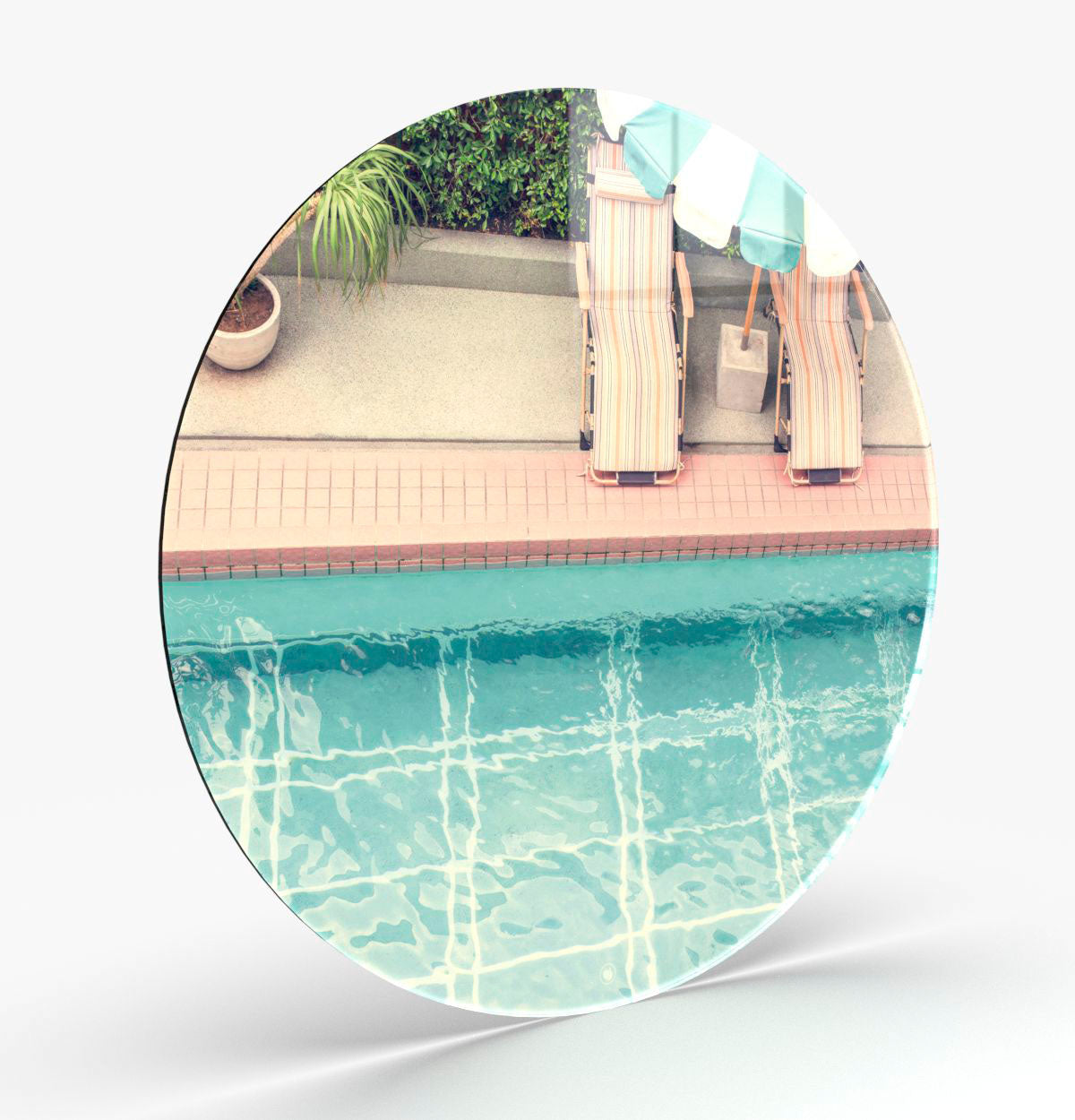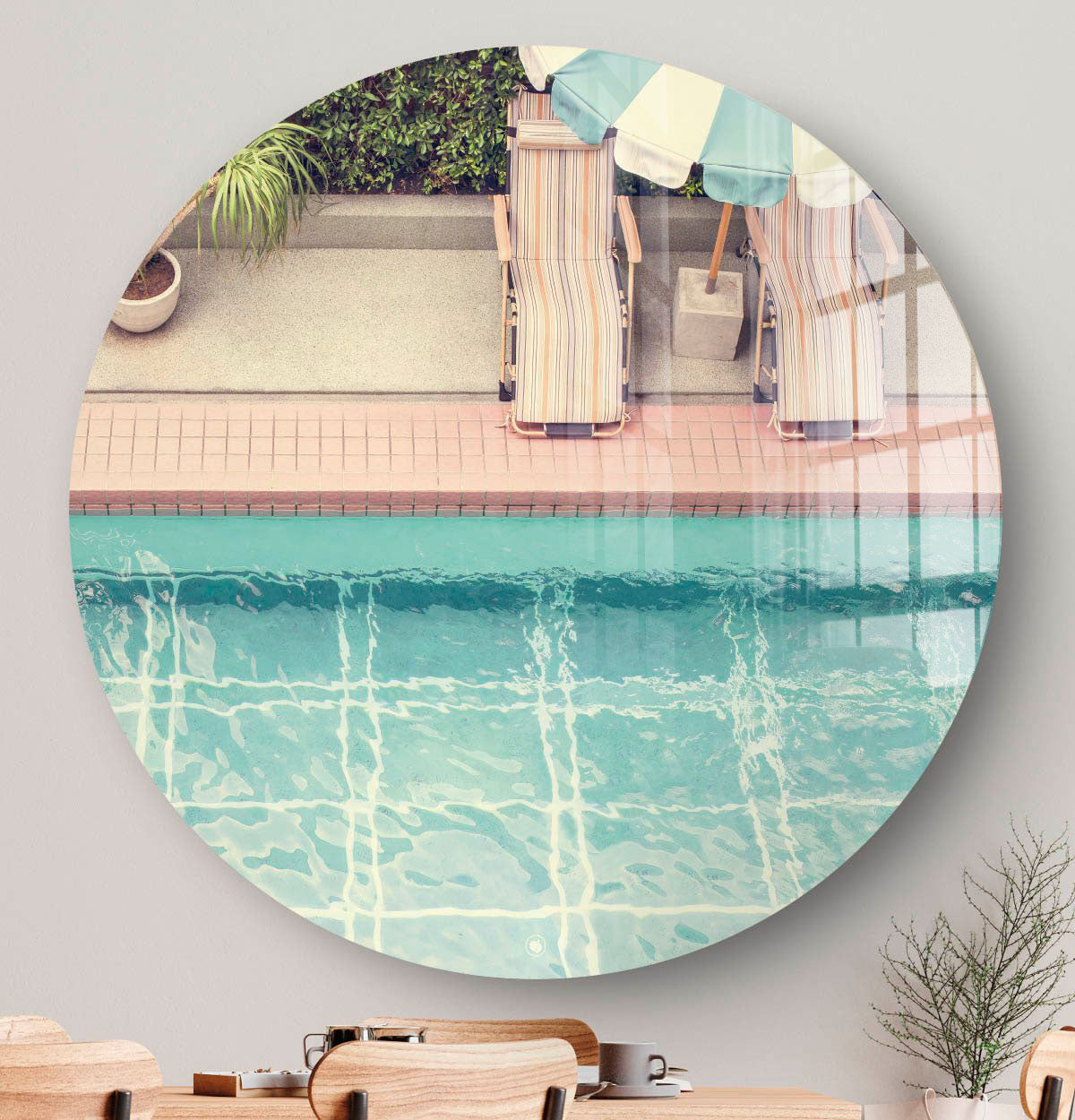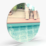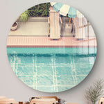 Heerlijk ontspannen bij het zwembad, maar dan in retro, vintage stijl! Deze wandcirkel heeft iets weg van de beroemde werken van Slim Aarons. Deze fotograaf staat bekend om onder meer zijn bijzondere  ‘poolparty' beelden van de rich and famous in Amerika. De ligbedden en parasol hebben een typerende uitstraling voor de jaren ‘50 en ‘60. Zie jij jezelf al liggen met een cocktail? Het water is zo mooi helderblauw, dat je gelijk een duik zou willen nemen. Deze wanddecoratie is gemaakt van prachtig, premium materiaal. Combineer dit werk met andere muurcirkels uit de collectie of hang hem op als groot statement in de woonkamer, hal, slaapkamer of op kantoor. Geef zo een prachtige flair aan je interieur, waarbij je elke dag heerlijk kan wegdromen van dit mooie kuuroord.