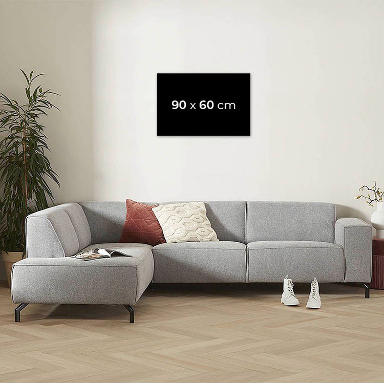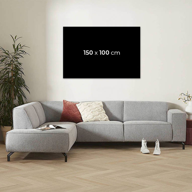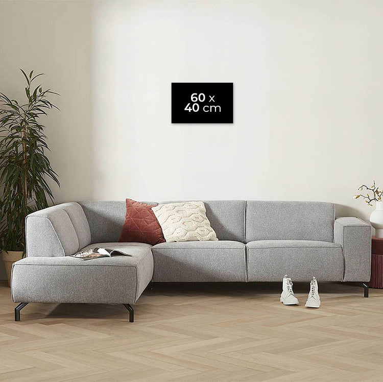 Kies hieronder de maat die je wilt zien aan de muur. Het bankstel op de afbeelding is een hoekbank van 275 cm breed en 77 cm hoog.